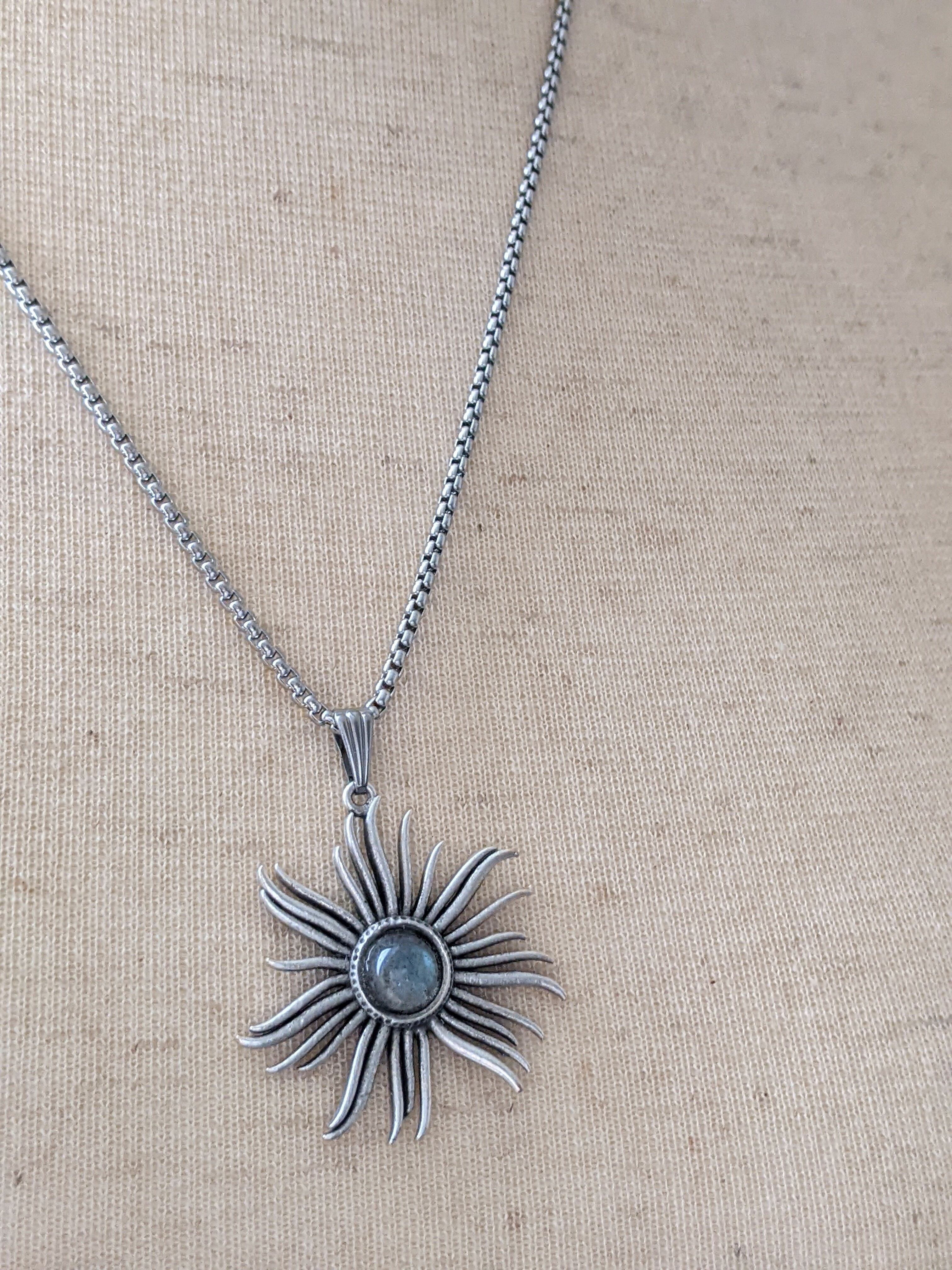 シンプルなチェーンと天然のラブラドライトでデザインされていて